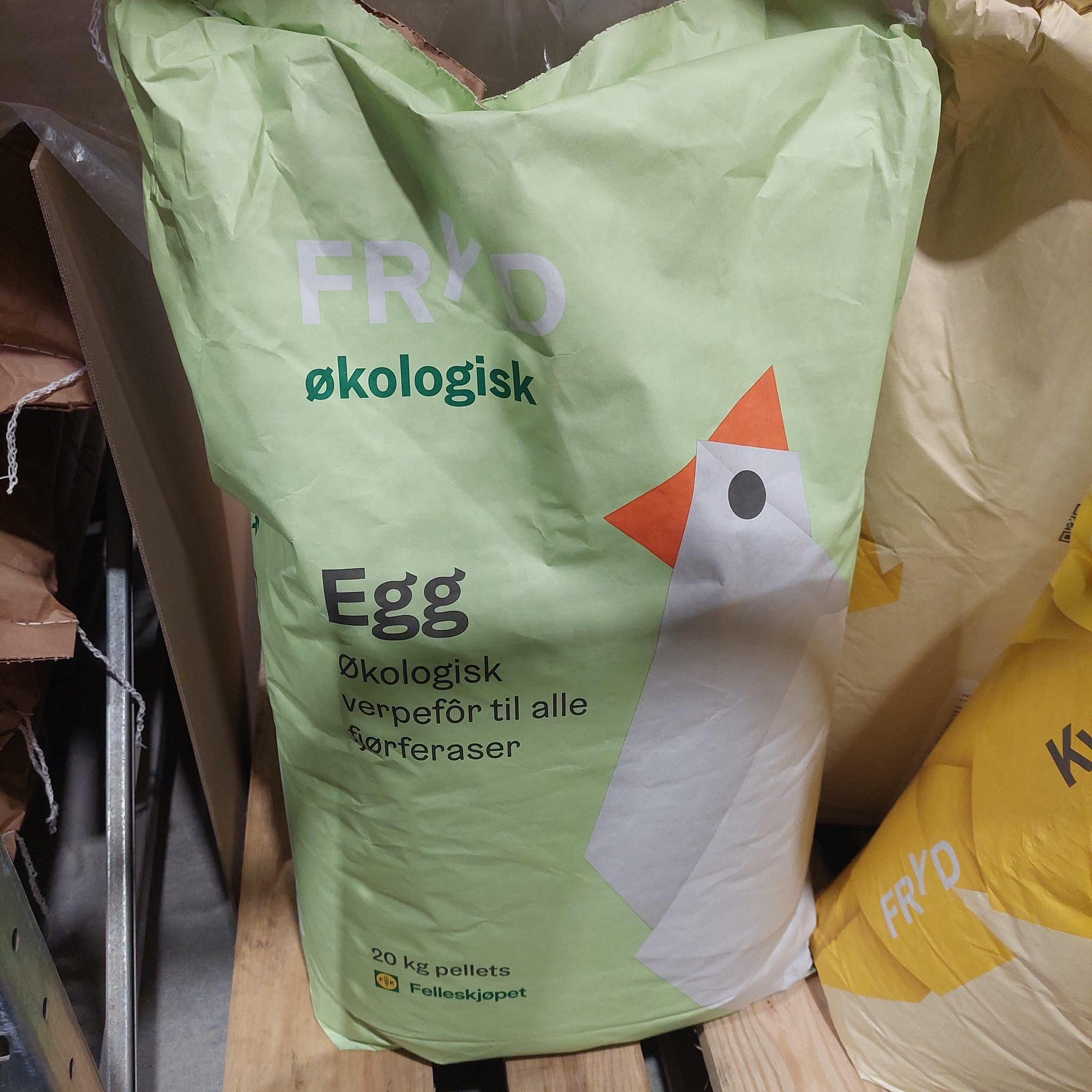 Får de annet kraftfor? Ja, jeg gir Fryd økologisk egg til høner når de har kommet litt ut i verpeperioden, jeg gir de i en egen beholder eller øverst i troa, en utedeling med jevne mellomrom, de får det når jeg er der med de. Dette er forbeholdt de som verper og det er en av mine tiltak for at de skal få litt mere kalsium. Hønene pleier å dukke opp når jeg kommer for å gi dette. Dette lar jeg aldri stå fremme siden jeg har blanda flokker hvor det også befinner seg haner og ungdyr sammen med høner. De sistnevnte skal ikke ha kalsiumberiket fôr, i hvertfall ikke i store mengder. Kalkstein står av samme grunn heller ikke fremme til utdeling for alle og enhver. En sjelden gang kan jeg servere dette til høner som verper. Jeg mener at høner som ikke er avlet for å produsere mengder med egg heller ikke trenger mengder med kalsiumberiket fôr eller kalkstein.