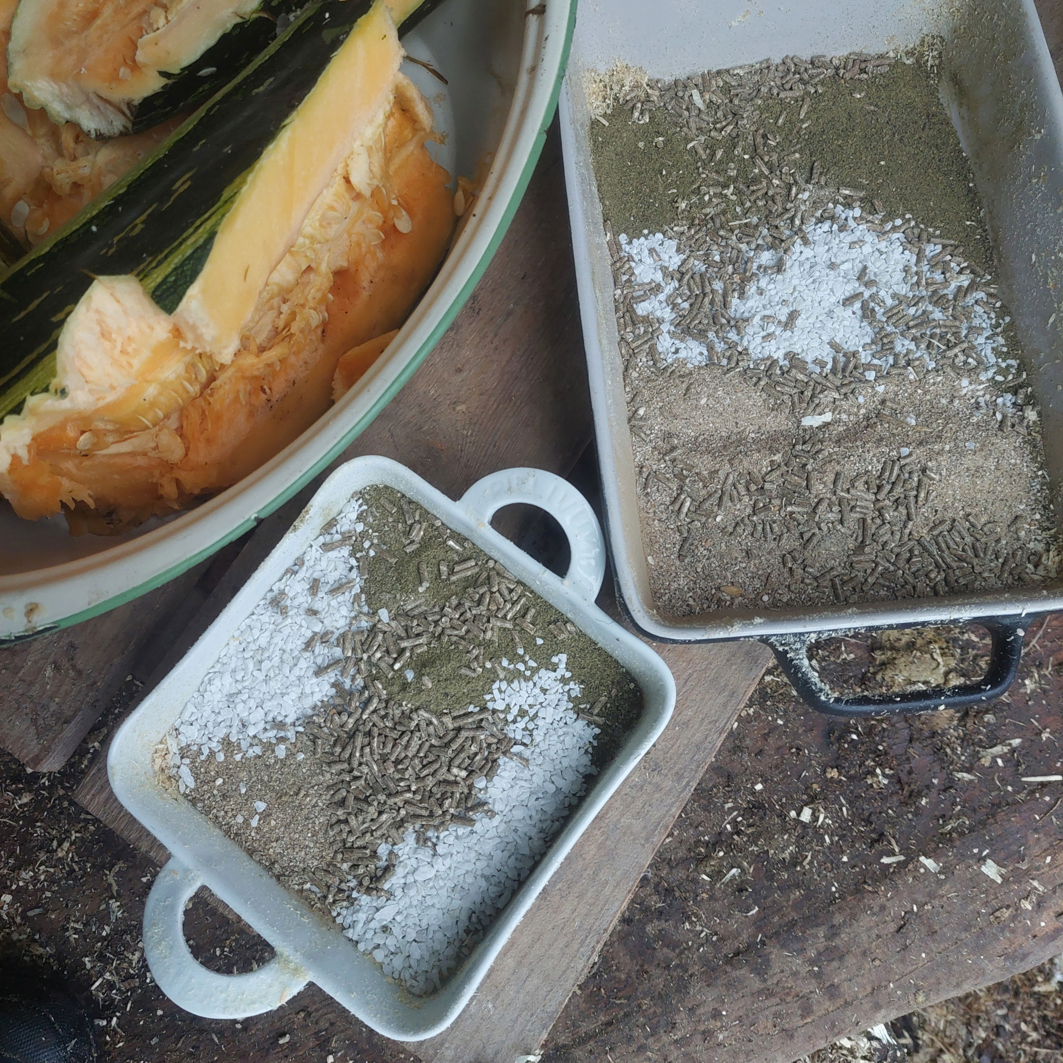 Fermentering: ca en 1/4 av maten jeg gir de fermenteres, dette gjelder korn, kraftfor, bær, grønnsaker og enkelte matrester. Se egen side om fermentering.